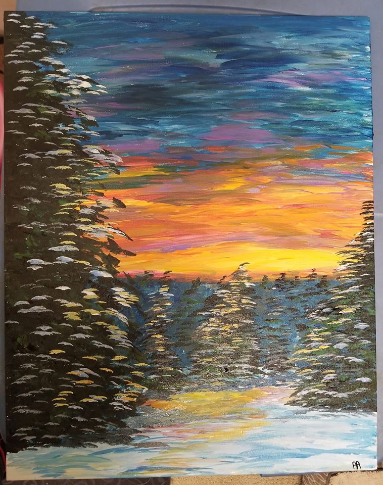 Snowy sunset 16 by 20 acrylic on canvas